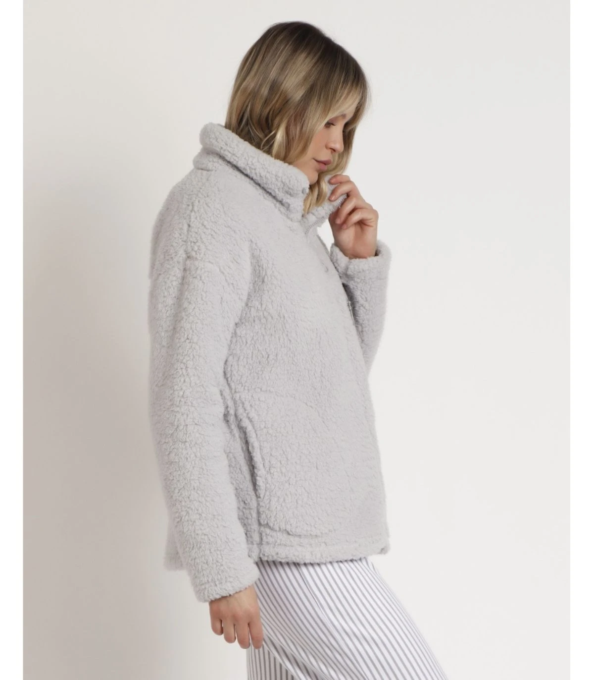 Confeccionada con un tejido especial borreguito, esta bata es increíblemente suave al tacto y muy calentita, garantizando una sensación acogedora. Está disponible en cuatro elegantes combinaciones de color, siendo el gris perla una opción sofisticada y versátil.